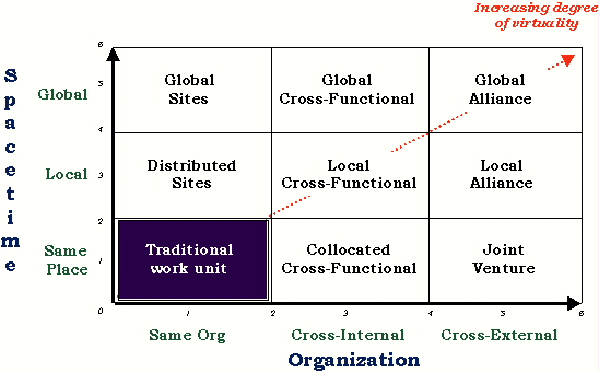 In traditional Industrial Age co-located teams, people work side-by-side in the same space at the same time on interdependent tasks for the same organization. Several decades ago, even before the new communications technologies were widely available, one form of virtual team begins to appear, the cross-functional team.