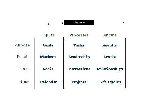 What is the basic data that a virtual team must acquire about itself? To account for all the essential characteristics that comprise virtual organizations, we need to go down a level, expanding each dimension into three elements. We array these 12 elements in the familiar systems model of inputs, processes, and outputs (Figure 12.x). This generates a “periodic table” of organizational elements, providing the conceptual infrastructure for practical approaches to creating and managing virtual groups at any scale.