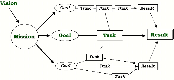 Vision flows into mission, which becomes the highest-level goal. To accomplish the overall purpose, segment mission into sub-goals, the first steps toward the division of labor. Tasks are the specific steps taken to achieve results. Some steps are serial, each dependent on the one before. Other tasks are independent and parallel, coming together at the end or interdependently across tracks of parallel activity. Most virtual-team work is a mix of these modes.